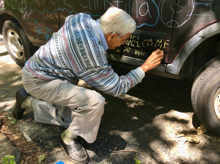 Most often, we would write a question on the car in brightly colored chalk. Then, we left the box of chalk behind by the bumper of the car. Friends, neighbors, and strangers shared their answers. We often asked, “What does the world need more of?” The answers were joyful, loving, and profound: love, chocolate, peace, Super Bowl victories, fried chicken, laughter, hugs, AA meetings, poetry, Jesus, art, time with my grandchildren, gratitude, and more. I was often surprised by how heartfelt the answers were – written by strangers.