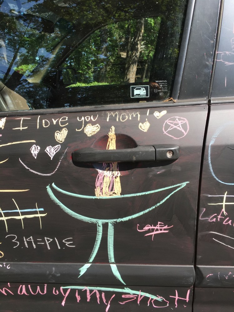 This old model Honda had lost much of its paint after years in the West Texas desert where it was driven by my mother years ago, but it still had lots of life left in it. So, we brought it home with us to Georgia. Instead of a new paint job, we chose chalk paint. It became a blank canvas on which we could play. We drew pictures and shared poetry on it. We asked questions for others to ponder. With each rainfall, the canvas was washed clean, and we could create again.