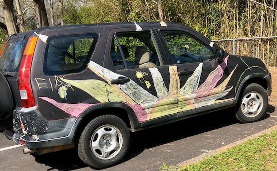 I drove it for several years, and then my oldest daughter drove it in her college years. Finally in 2022, it finally went kaput. It had become a community point of interest where we lived. My daughter was known as the “art car girl.” We shared the car at local events. Most often, the children drew on it. Yet, when invited, adults openly would too. It brought people together. This art car was a medium for bringing people “out of their shell” and invited unexpected playfulness and reflection amidst the usual rigidity of adult life.